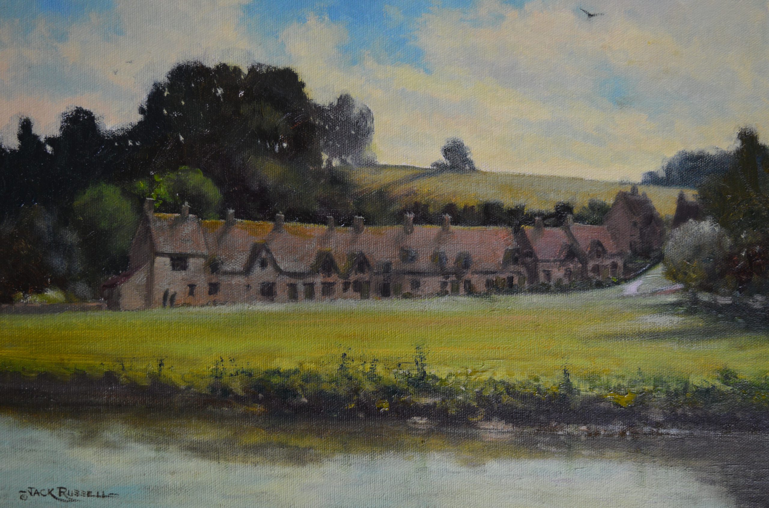 “This painting of Arlington Row, Bibury was inspired by Radio 5 Live listeners who were following me on twitter during a days painting in the Cotswolds. The cottages were built in the early 1300’s as a monastic wood store but were converted in the seventeenth century to house local weavers.” Jack Russell MBE