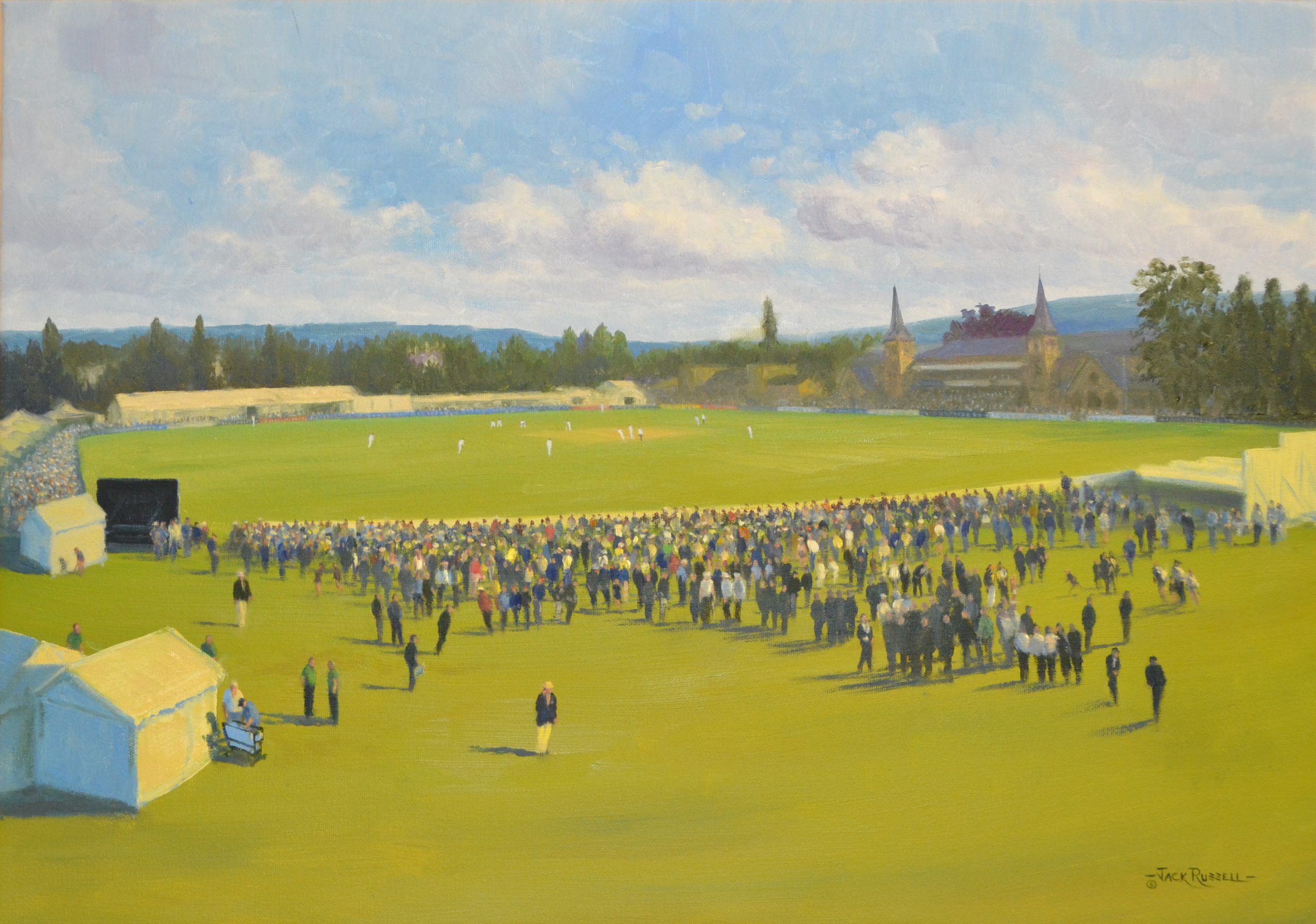 “I wanted to paint a quintessentially English County cricket festival ground. Because of health and safety I wasn’t allowed to sit on the roof of the College buildings at Cheltenham, so instead the groundsman organised for me to go up in a cherry picker. We had it at it’s maximum height, which took me to about half way up the side of the College Chapel. I couldn’t have picked a better angle!.” Jack Russell MBE
