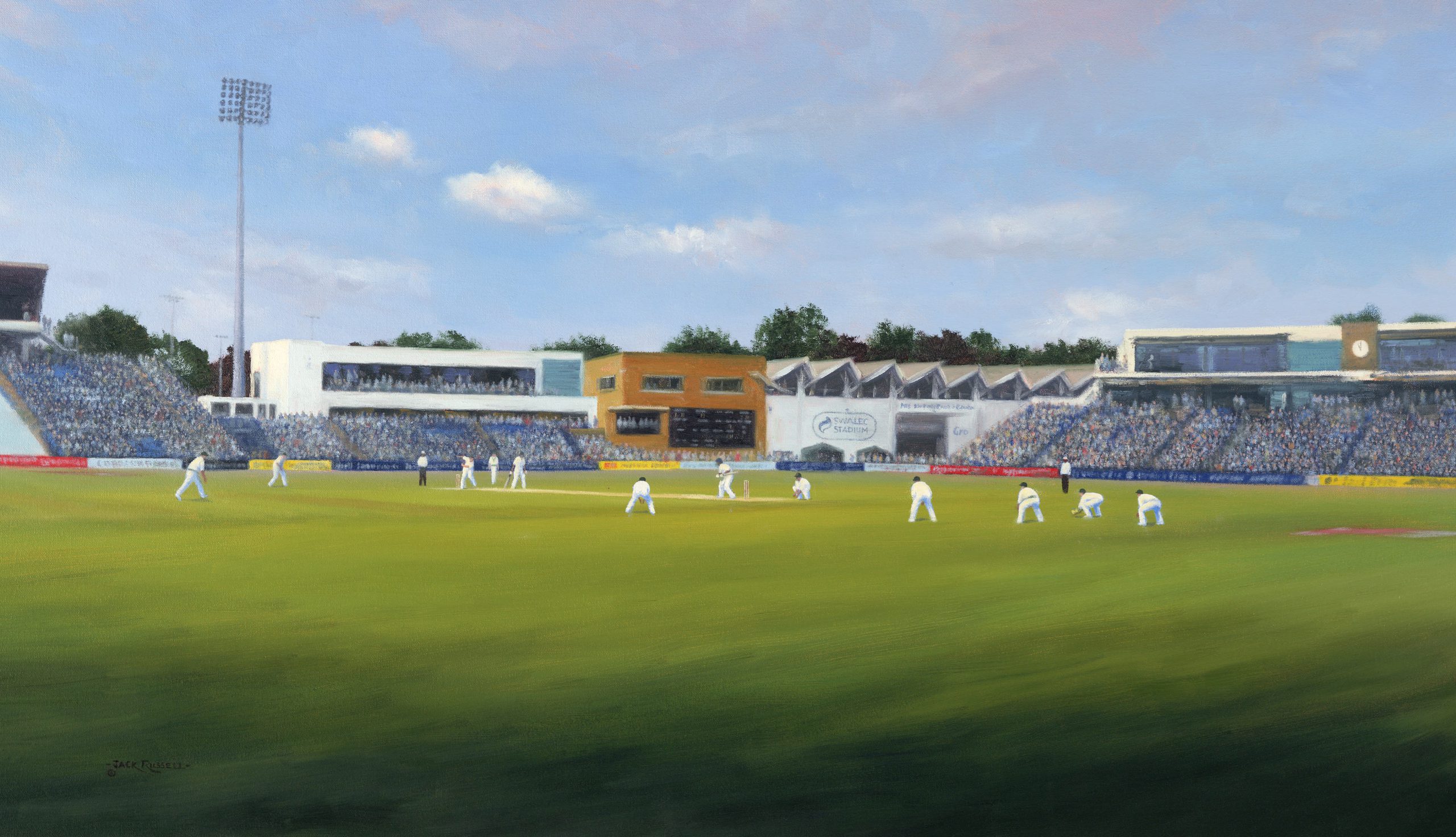 “This painting shows the historic moment when the first ball was bowled in a Test Match in Wales, at the Swalec Stadium, Cardiff.” Jack Russell MBE