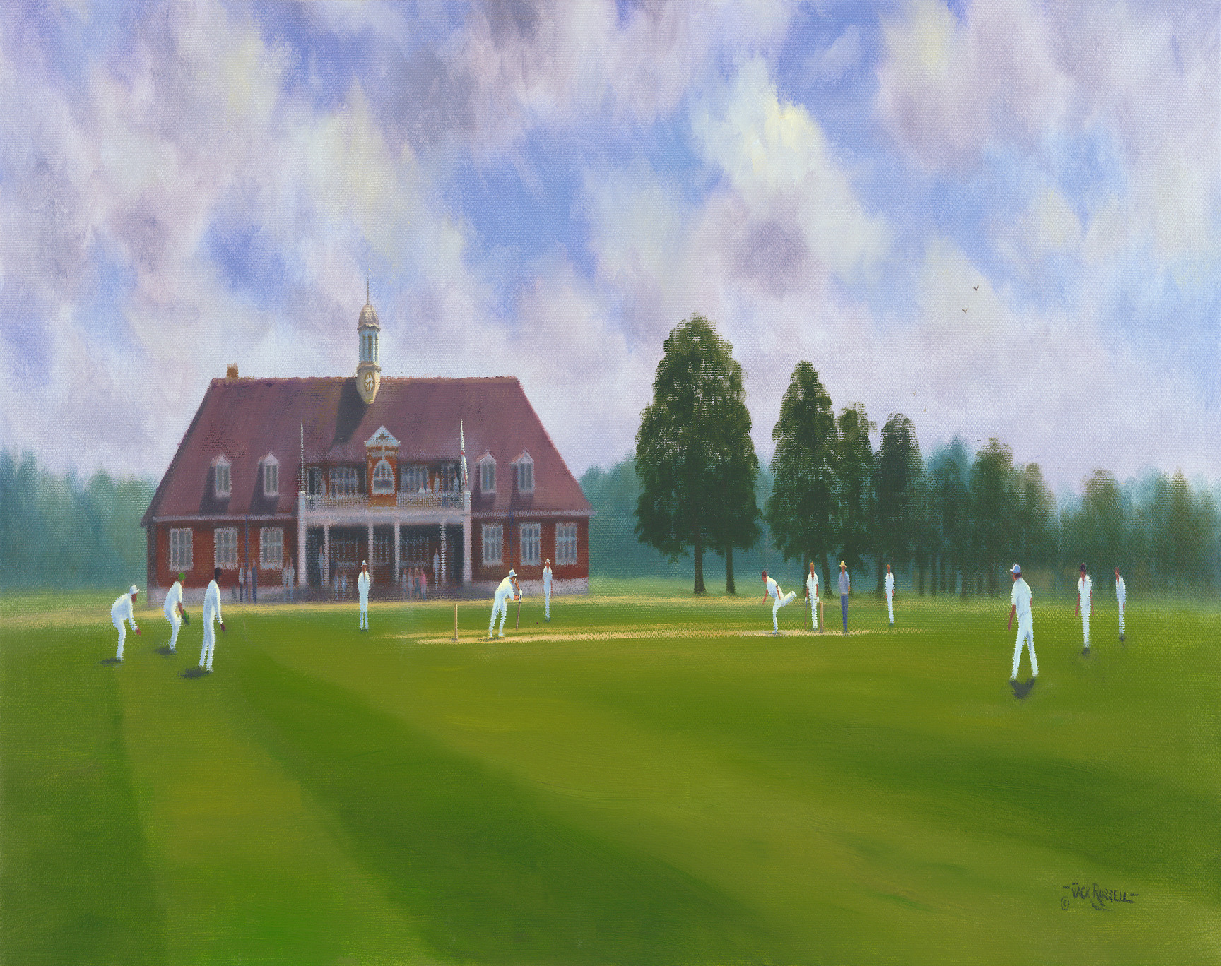 “The annual match between two Old Bailey teams ‘The Clerks’ against ‘The Recorders’. This one played at Dulwich College, shows the fabulous pavilion in the background. I think this is the only cricket painting I’ve painted where the Umpire is wearing jeans!.” Jack Russell MBE