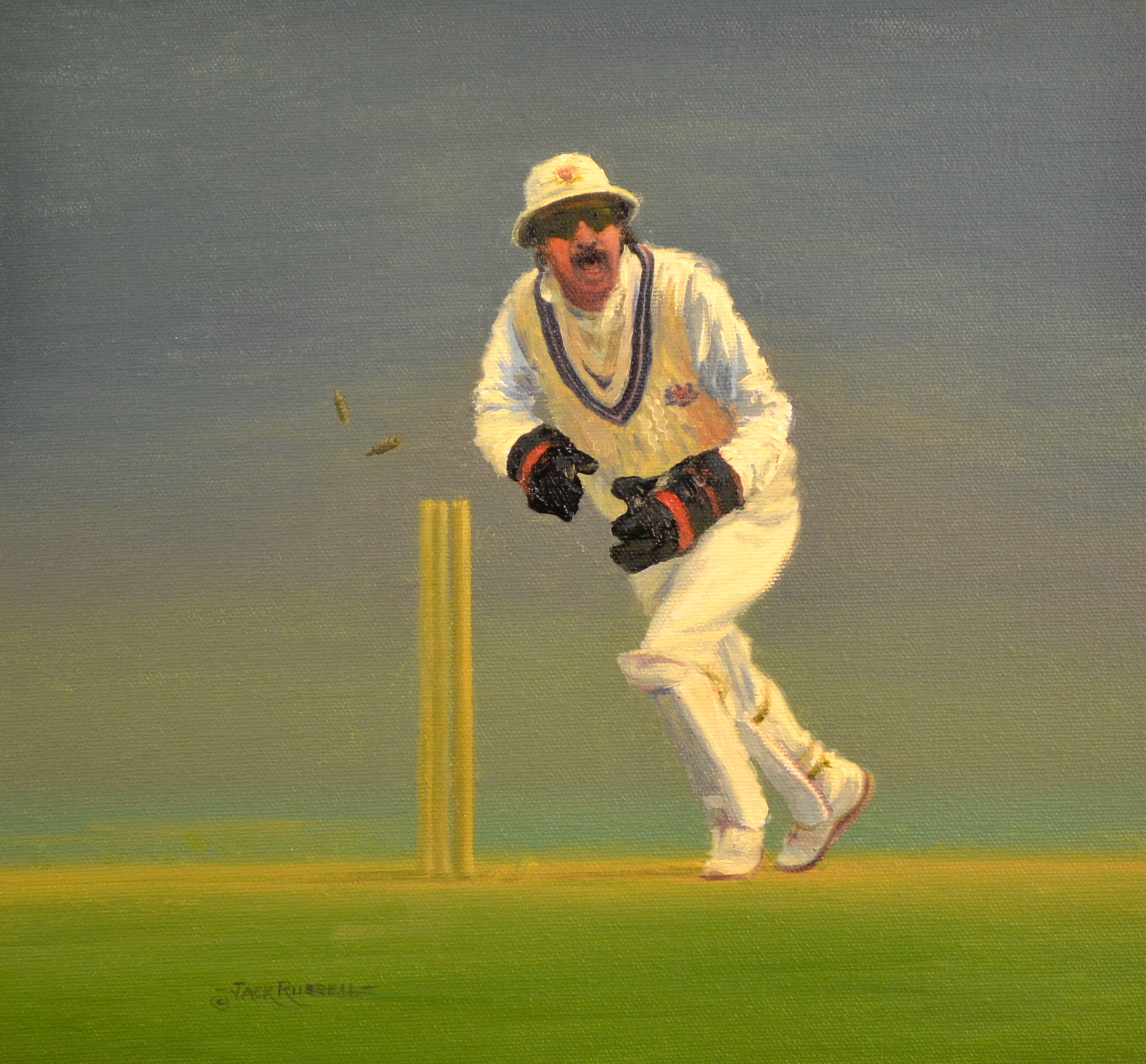 “This painting shows Jack playing for Gloucestershire during the County’s period as ‘One Day Kings’. This picture was used on the cover of his latest book ‘The Art of Jack Russell~A Personal Journey through Eighteen Counties’.”